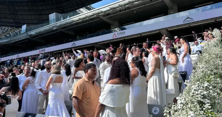 Centenas de pessoas se casaram na Arena MRV, em Belo Horizonte, nesta sexta-feira (7). O projeto do Tribunal de Justiça…