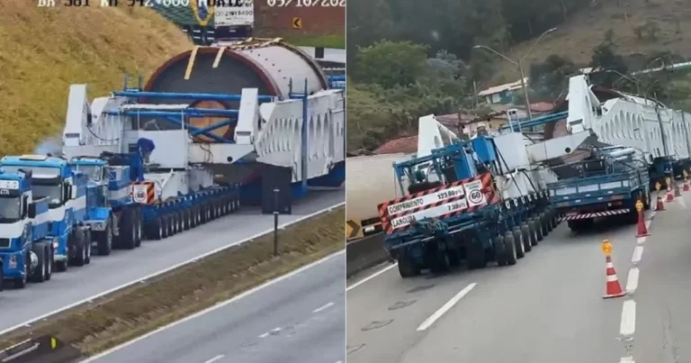 A carreta que transporta um sistema de moagem de 850 toneladas está parada há uma semana no mesmo trecho da…
