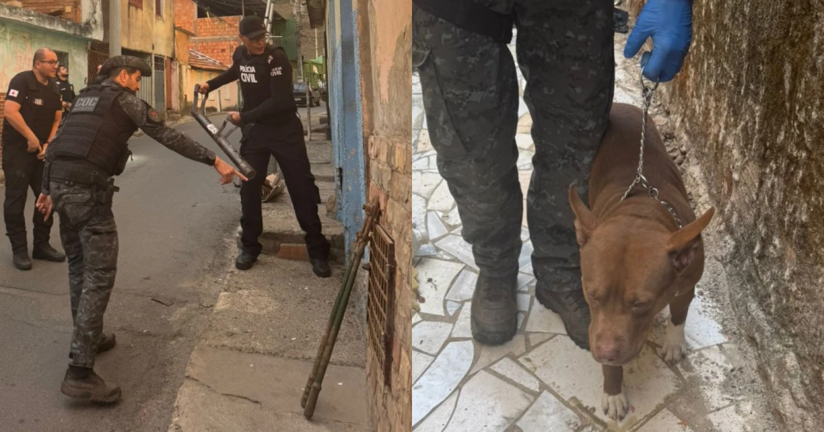 No local, os policiais encontraram um cachorro da raça pit bull que era utilizado para proteger o ponto de tráfico e dificultar a entrada das equipes. O animal estava em condições insalubres e apresentava uma lesão grave no ouvido.