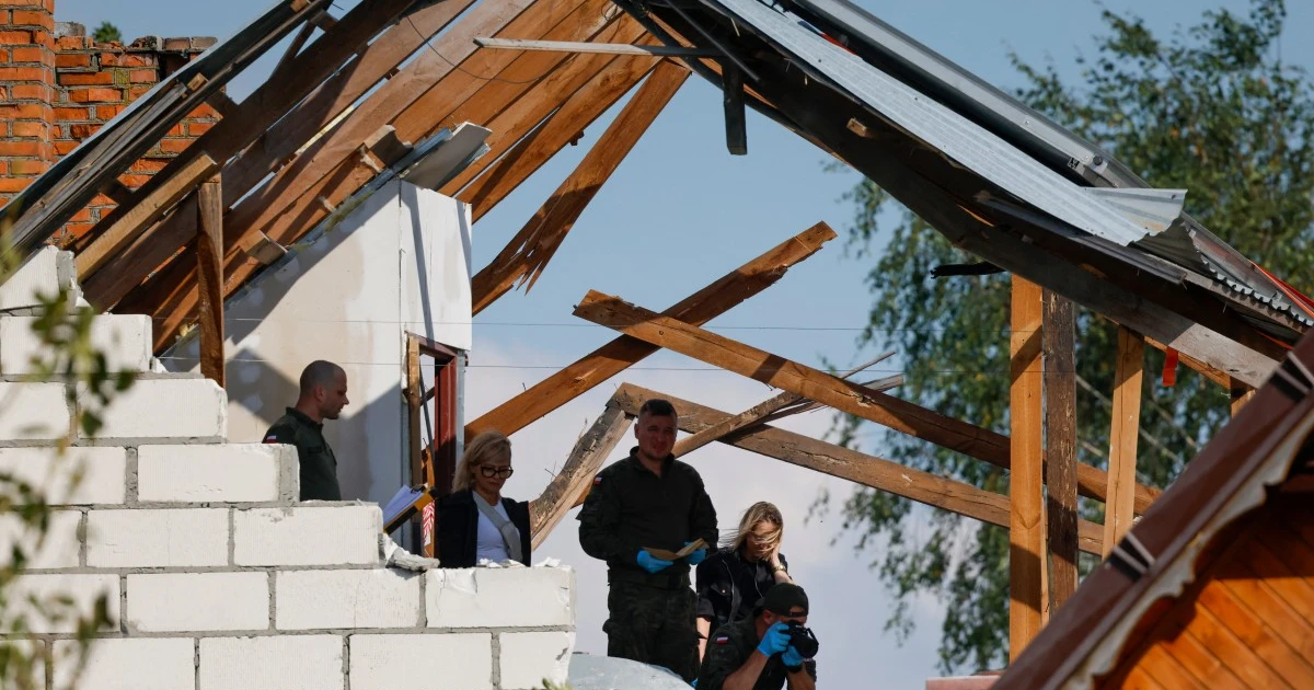 Imagens mostram policiais e militares do Exército polonês inspecionando danos à casa, que teve sua parte superior totalmente danificada pelos destroços. Ninguém se feriu durante o ocorrido, segundo o governo polonês.